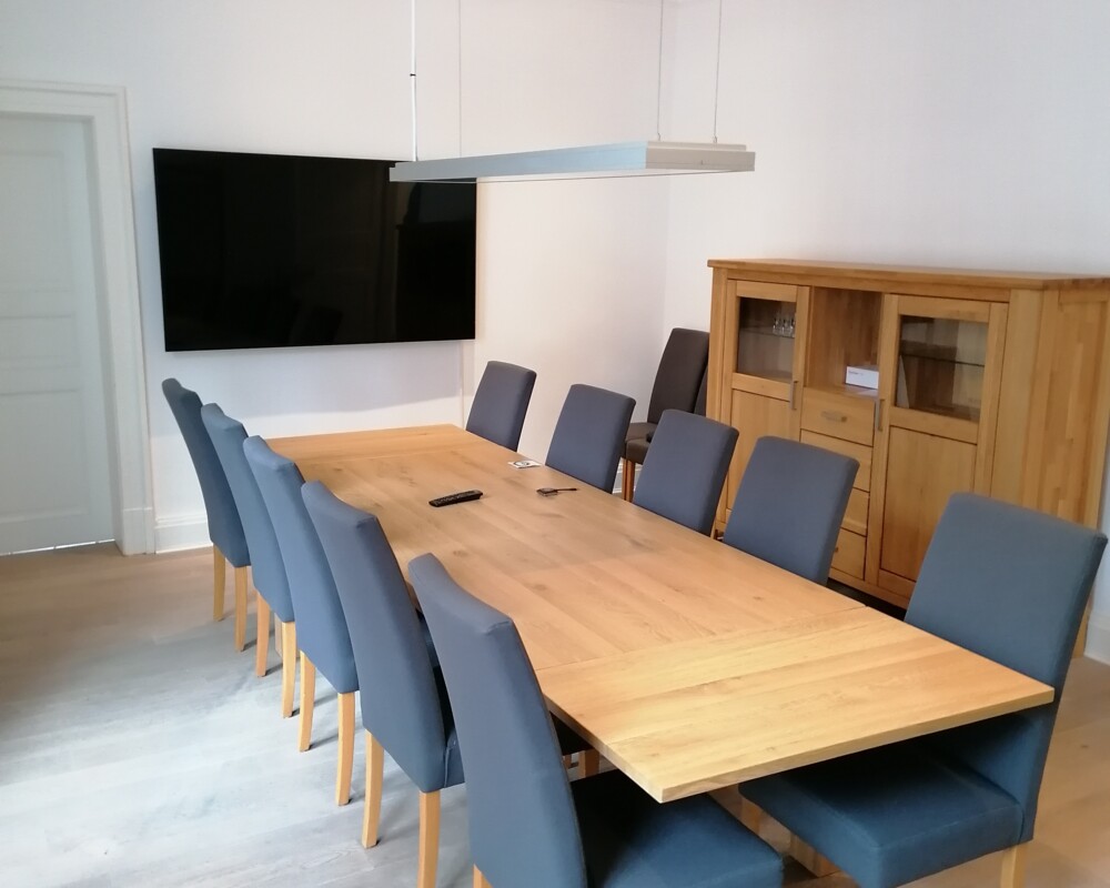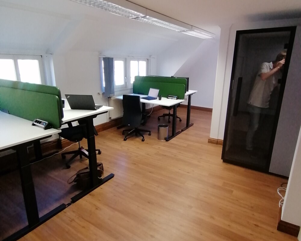 Die Fläche im Obergeschoss teilt sich auf in einen Coworking-Space, welcher vier Arbeitsplätze umfasst und drei weiteren Büros mit jeweils zwei Arbeitsplätzen. Diese Büros werden primär für Start-Ups oder Kleinunternehmer vorgehalten. Bei zu hoher Auslastung im CoWorking-Space ist zudem das Ausweichen auf diese Flächen vorgesehen, sofern die Büros zu dem jeweiligen Zeitpunkt nicht vermietet sind. Bei Interesse melden Sie sich gerne.